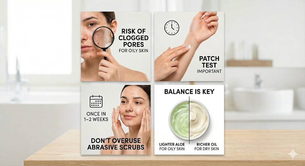 - Balance is key: For oily or combination skin, you may skip heavy oil-based creams and stick to lighter aloe-vera masks; for dry skin, richer oil-based care may help more.